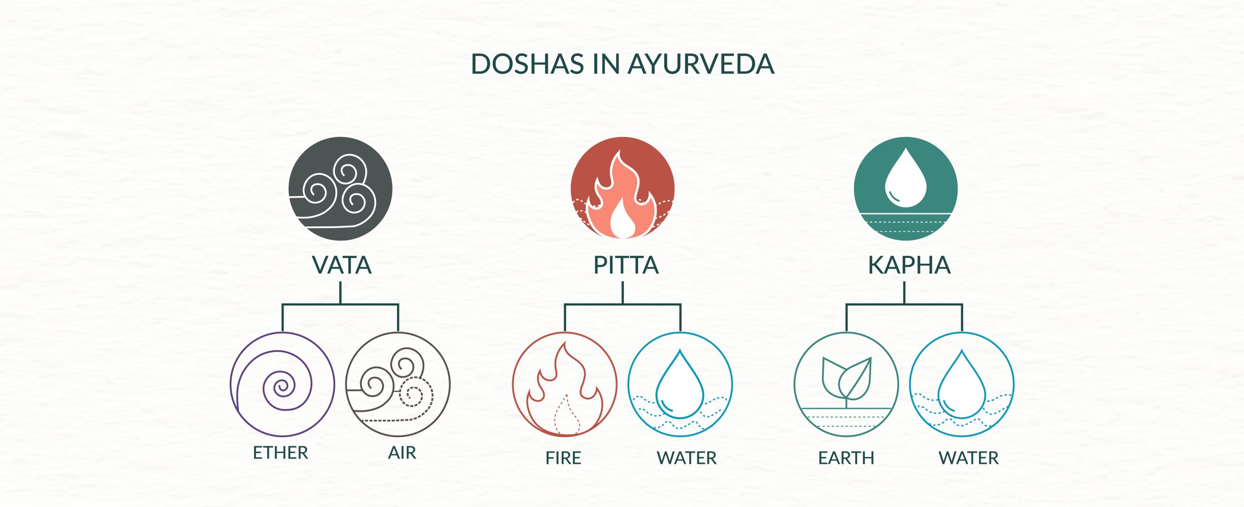 At the core of Ayurvedic philosophy are three interconnected concepts – The Panchamahabhutas (five great elements), the Ayurvedic Doshas (vital governing energies in the body),